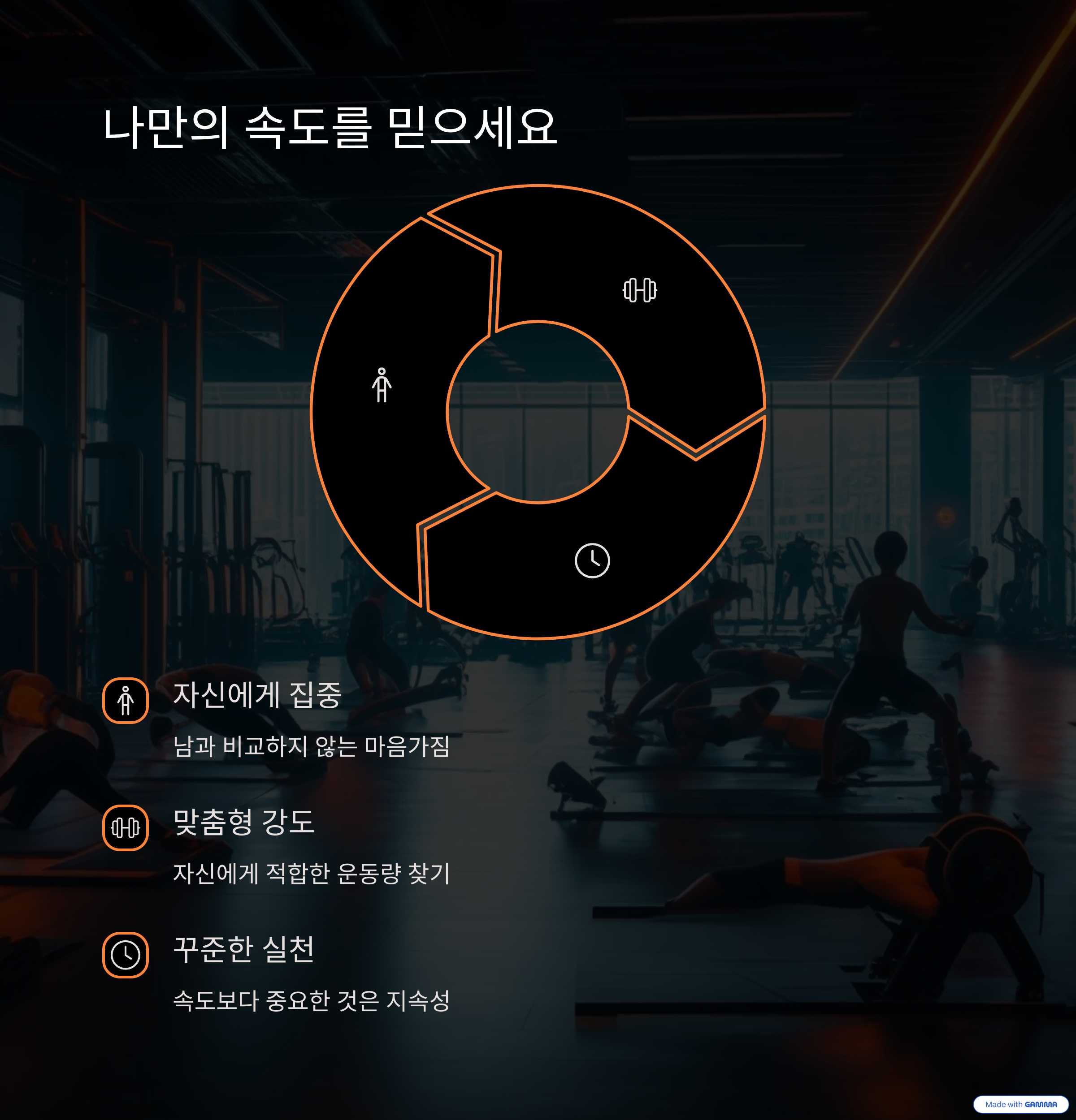 | 전신운동과 유산소를 3:2 비율로 섞어 구성 | 기초 근력 위주로 기구 운동부터 시작하세요 | 무리하지 않고 자신만의 루틴을 꾸준히 반복 |