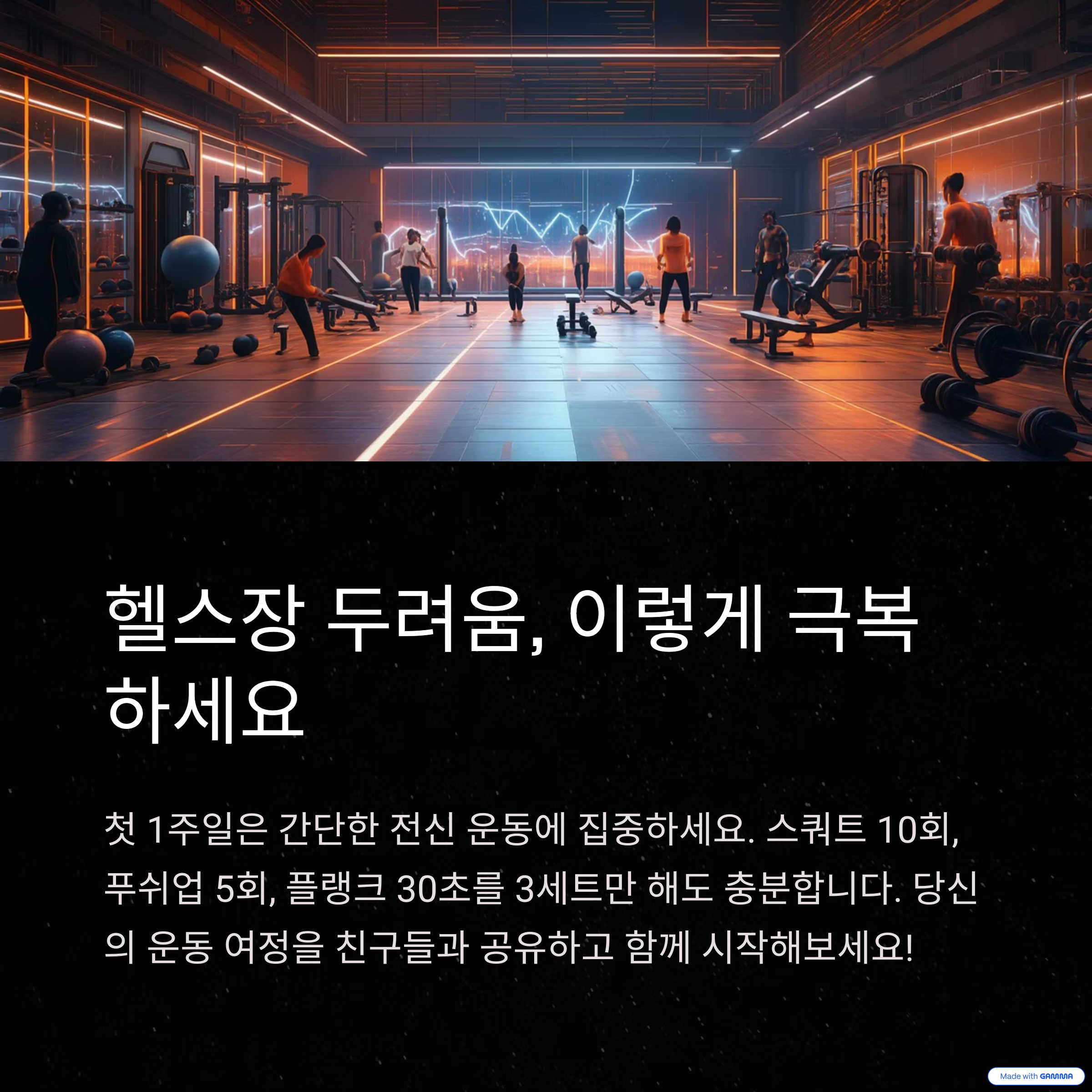 처음 헬스장에 가는 것은 누구에게나 낯설고 어려울 수 있습니다. 하지만 간단한 루틴과 꾸준한 실천만 있다면, 운동은 곧 습관이 되고, 습관은 삶의 일부로 자리 잡게 됩니다. 오늘부터 무리하지 않고, 나만의 속도로 시작해보세요. 변화는 생각보다 가까이에 있으며, 가장 중요한 것은 포기하지 않는 자세입니다. 여러분의 건강한 시작을 응원합니다!